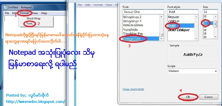 (Copy - Paste) (Cut - Paste) က အသံုးျပဳပံုခ်င္းတူပါတယ္..။ နဲနဲေလးပဲ ကြာတယ္..။ အလြယ္ေျပာရင္ (Copy - Paste) က ဒီဘက္ file ထဲက ေဆာ့ဝဲလ္ေတြ၊ စာသားေတြ ကို ဟိုဘက္ file ထဲကို ေကာ္ပီကူးျပီး ေနာက္တစ္ခု ပြားလိုက္တာပါ..။ ဖိုင္အေဟာင္းထဲမွာလည္း က်န္ခဲ့ပါတယ္..။ ဖိုင္အသစ္ထဲလည္း ေရာက္သြားပါတယ္..။ (cut - paste) ကေတာ့ ဖိုင္အေဟာင္းထဲမွာမက်န္ခဲ့ပါဘူး..။ ဖိုင္အသစ္ထဲ ကို အကုန္ေရာက္သြားပါတယ္..။ စာသားေတြကိုေကာ္ပီကူးမယ္ဆိုရင္ေတာ့... အရင္ဆံုး စာေၾကာင္းေတြကို စလက္ေပးဖို႔လိုပါတယ္..။ စလက္ေပးတယ္ဆိုတာ ေျပာင္းဖို႔၊ေရႊ႔ဖို႔၊ ဖ်က္ပစ္ဖို႔ အတြက္ အရင္ဆံုး ကြန္မန္းေပးလိုက္တဲ့သေဘာပါ...။ စာေၾကာင္းေတြကို ဘယ္လိုစလက္ေပးရမလဲဆိုေတာ့ အရင္ဆံုး စာေၾကာင္းတစ္ေၾကာင္းကို ေမာက္စ္ရဲ့ လက္ညိဳးခလုတ္နဲ႔ ဖိႏွိပ္ျပီး ဆြဲသြားလိုက္ပါ..။ စာေၾကာင္းေလးေတြကို အျပာေရာင္အတန္္းေလးက ဖံုးသြားပါလိမ့္မယ္..။ အျပာေရာင္ေအာက္မွာ စာေတြလည္းျမင္ေနရပါတယ္..။ အဲဒီလို အျပာေရာင္ေလး အနည္းငယ္ စာေတြေပၚဖံုးသြားျပီဆိုရင္ (Ctrl+A) ကီးႏွစ္လံုးကို တြဲျပီးႏွိပ္ခ်လိုက္ပါ (Ctrl+A ဆိုတာ All Selct ပါ)..။ တကယ္လို႔ ကိုယ္က စာေၾကာင္း ၂ေၾကာင္း၊ ၃ေၾကာင္းေလာက္ပဲ လိုခ်င္တယ္ဆိုရင္ေတာ့ .. ကိုယ္လိုခ်င္သေလာက္ စာေၾကာင္းေလးကိုပဲ ေမာက္စ္ရဲ့ လက္ညိဳးခလုတ္နဲ႔ ဖိဆြဲသြားလိုက္ပါ...။ ကိုယ္လိုခ်င္သေလာက္ရျပီဆိုရင္ ရပ္လိုက္ပါ..။ အဲလိုႏွိပ္လိုက္ရင္ေတာ့ စာသားေတြအားလံုးက အျပာေရာင္ေအာက္ကို ေရာက္သြားပါျပီ...။ ေမာက္စ္မွ်ားေလးကို အဲဒီအျပာေရာင္ဖံုးေနတဲ့ စာသားေပၚမွာတင္ျပီ Right Click (ေမာက္စ္ရဲ့ လက္ခလယ္ခလုတ္) ကို တခ်က္ႏွိိပ္ပါ...။ ေပၚလာတဲ့ ေဘက္စ္ထဲက Copy ဆိုတဲ့ စာေၾကာင္းကို တခ်က္ႏွိပ္လိုက္ရင္... ေစာေစာန စလက္ေပးထားလို႔ အျပာေရာင္ဖံုးေနတဲ့ စာသားေတြကို ေျပာင္းဖို႔၊ ေရႊ႔ဖို႔ အမိန့္ေပးလိုက္တာ ျဖစ္ပါတယ္..။ ျပီးရင္ေတာ့ Notepad ကိုဖြင့္ရမွာပါ..။ စာသားေတြ သိမ္းခ်င္ရင္ေတာ့ Notepad နဲ႔မွ ရပါမယ္..။ Notepad ကို ဖြင့္ျပီရင္ အဲဒီဖြင့္ျပီးသား Notepad ေပၚမွာ ေမာက္စ္မွ်ားေလးကိုတင္ျပီး Right Click ေထာက္(ႏွိပ္)လိုက္ပါ .. ေပၚလာတဲ့ေဘာက္စ္ထဲမွာ Paste ဆိုတဲ့စာလံုးကိုႏွိပ္လိုက္ရင္... ဟိုဘက္ထဲက စာေတြ ဒီဘက္ထဲကိုေရာက္လာပါျပီ..။ ဒါေပမယ္ ့ ဖတ္လို႔မရေသးပါဘူး... ေလးေထာင့္ကြက္ေလးေတြ မဟုတ္ရင္ ကြက္ရွင္မတ္ေလးေတြပဲ ေတြ႔ရမွာပါ..။ တစ္ေနရာက်န္ေနေသးလို႔ပါ က်ေနာ္တို႔ Font ေျပာင္းေပးရပါမယ္..။ (အေပၚပံု(၂)ကိုၾကည့္ပါ) ...။